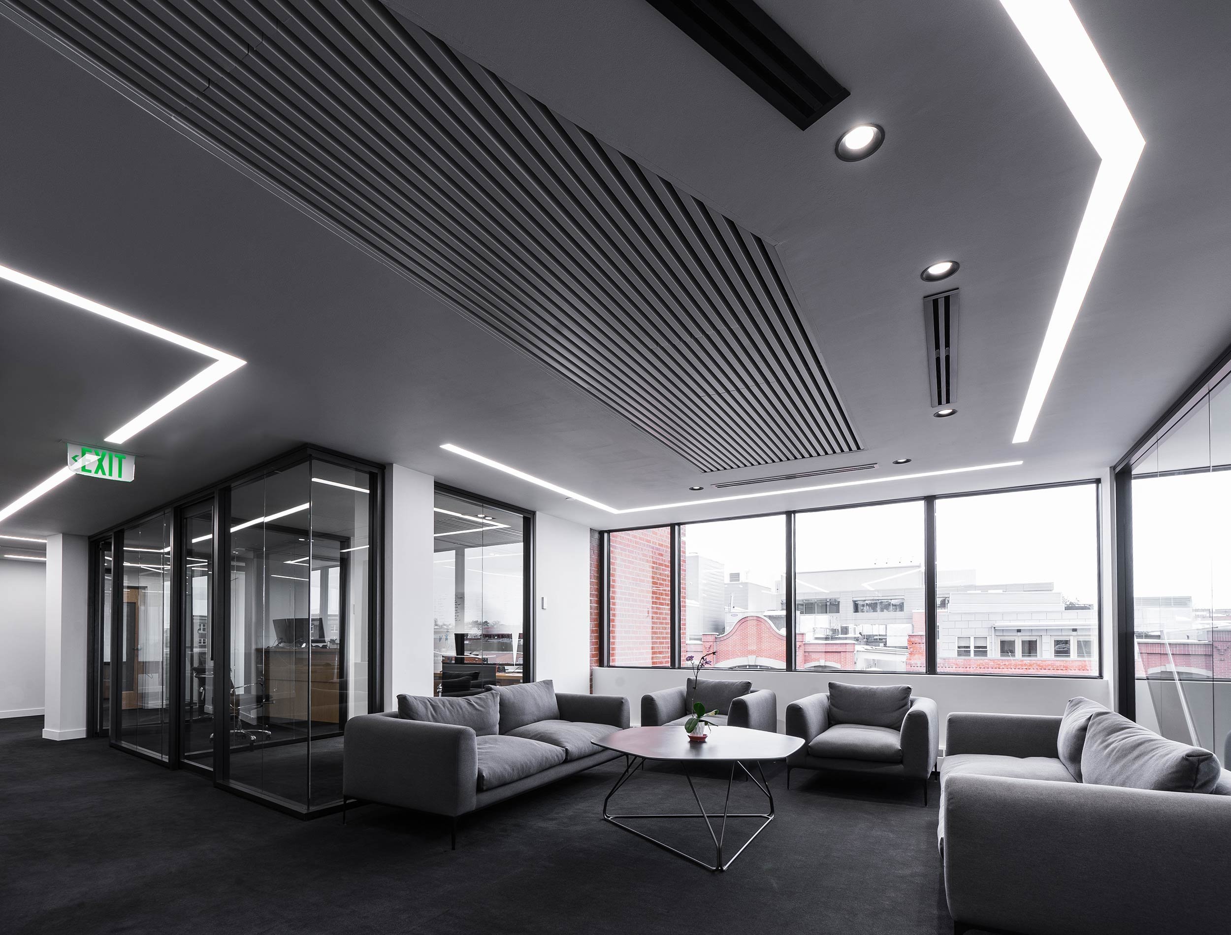 Visual connections across the entire office provide connectivity and encourage interaction, while the glass partitions provide acoustic privacy and defined offices. Linear lighting accentuates and defines space while drawing you through.